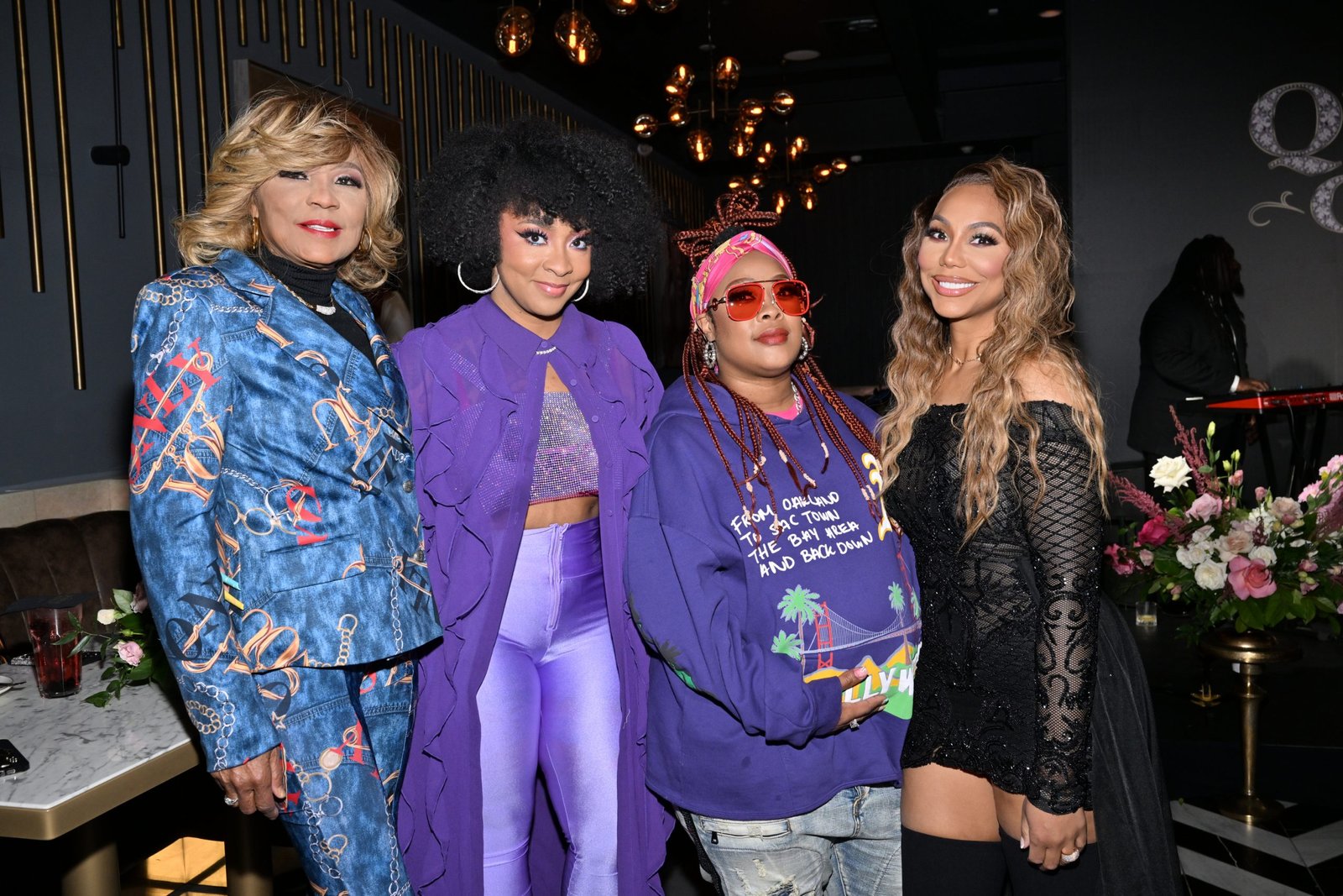 QUEENS COURT — “Queens Court Activation” — Pictured: (l-r) Evelyn Braxton, Jesseca Dupart, DA BRAT, Tamar Braxton at the Knife Modern Mediterranean on March 14, 2023 — (Photo by: Derek White/PEACOCK)